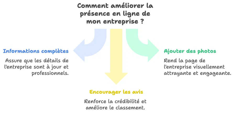 Assurez-vous que toutes les informations de votre entreprise sont complètes et à jour, y compris le nom, l’adresse, le numéro de téléphone, les heures d’ouverture et le site web.