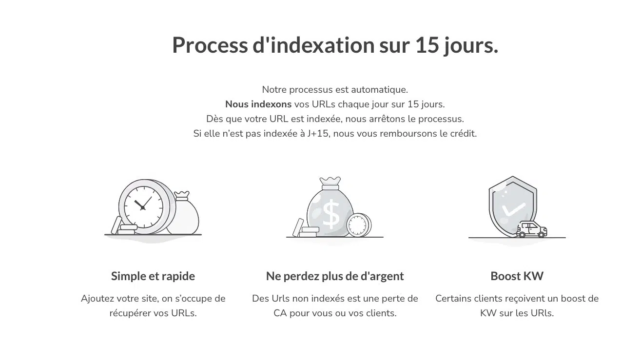 Grâce à la plateforme Indexation.fr, vous pourrez soumettre les pages de votre site qui ne veulent pas s’indexer dans le processus naturel de Google. La plateforme utilise un processus efficace qui permet d’indexer rapidement ses contenus. Vos pages ne sont pas indexées ? La plateforme vous rembourse 90% du crédit utilisé. Vous obtiendrez également un prix dégressif en fonction de vos usages, c’est pratique et idéal !!!